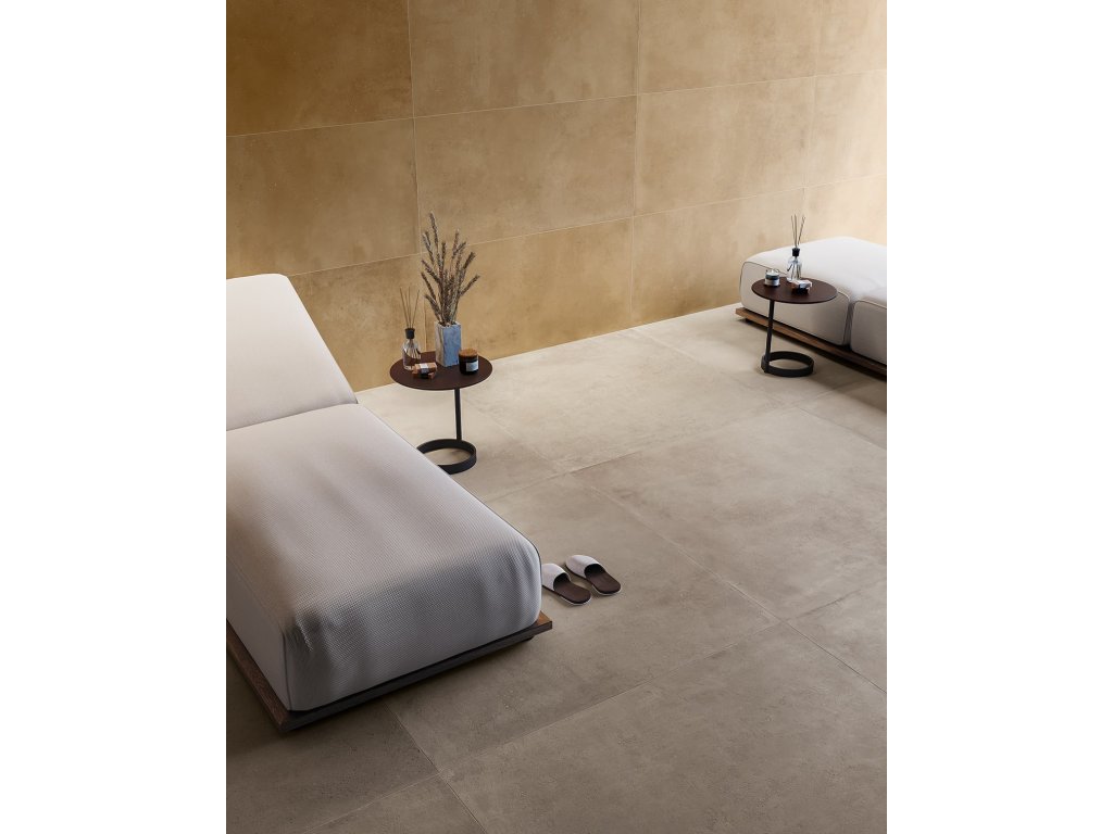 Povrch dlaždic má jemnou betonovou strukturu a elegantní matný vzhled, který se skvěle hodí do obytných i komerčních prostor. Díky široké škále rektifikovaných formátů (např. 60×60, 60×120, 80×80 cm) a neutrálním barvám – od světlé bílé a šedé po tmavší antracit – lze dlažbu snadno kombinovat s dalšími materiály, jako je dřevo, kov nebo sklo.