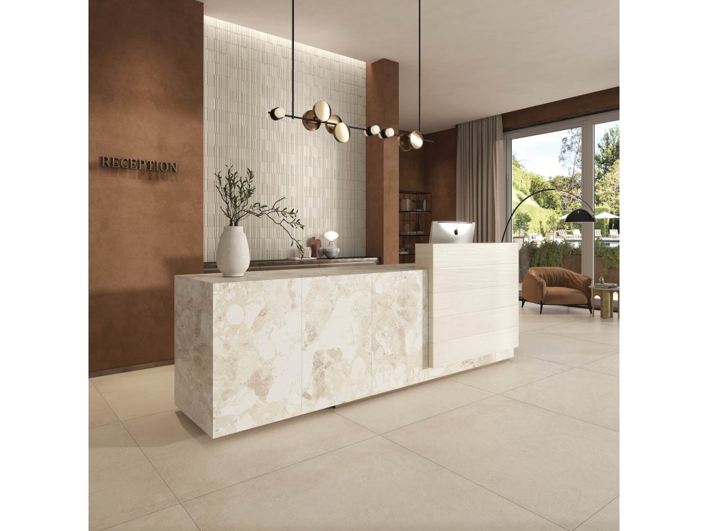 Povrch je matný a jemně strukturovaný, s přirozeným efektem opotřebení a drobnými nepravidelnostmi, které záměrně působí ručně a rustikálně. Barevná paleta obsahuje přírodní tóny – od pískové a béžové až po teple šedé varianty – které se skvěle hodí do venkovských i moderně rustikálních interiérů.